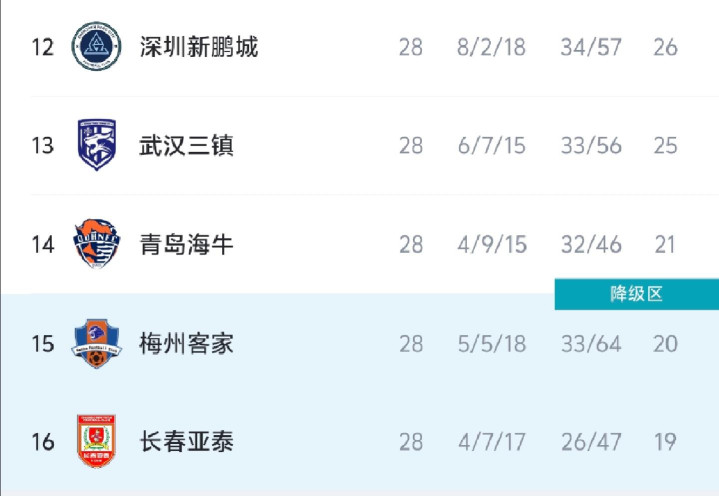 其他保级球队本轮赛果如下,梅州客家主场1-4惨败云南玉昆;深圳新鹏城客场2-1战胜武汉三镇脱离泥潭;长春亚泰客场痛失好局,遭天津津门虎读秒绝平。